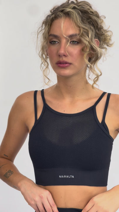 Top doble en licra y con malla, elaborado en tela inteligente con tecnología que se adapta al busto moldeándolo de forma natural y dando muy buen soporte.